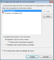 Aparecerá el cuadro de diálogo [Configuración del orden de varios documentos] cuando se selecciona la casilla de verificación [Seleccionar el orden de procesamiento de documentos al convertir los documentos seleccionados a un documento PDF único].
