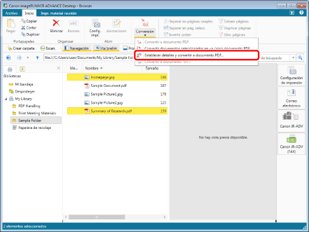(Conversión) en la cinta y seleccione [Establecer detalles y convertir a documento PDF].