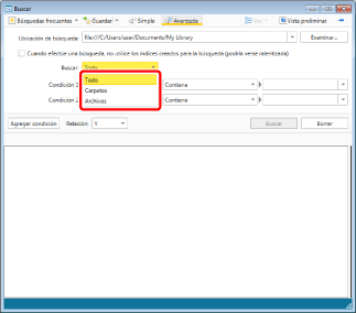 Busca carpetas. Si selecciona [Carpetas], sólo se pueden seleccionar propiedades de carpeta en las condiciones de búsqueda.