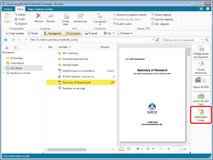 para una Carpeta de destino del documento mostrada en la barra de herramientas