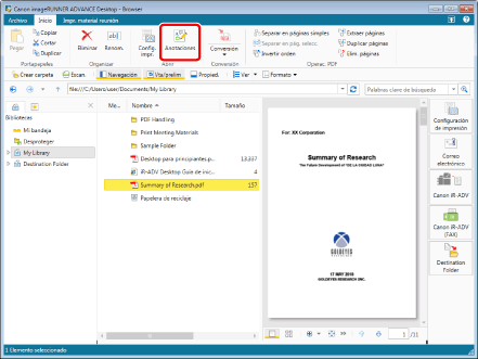 Si realiza una de las siguientes operaciones sin seleccionar un documento, la Carpeta de destino del documento se selecciona en la Ventana de navegación, y puede consultar las carpetas y documentos en la Carpeta de destino del documento en la Ventana de visualización de la lista de archivos.