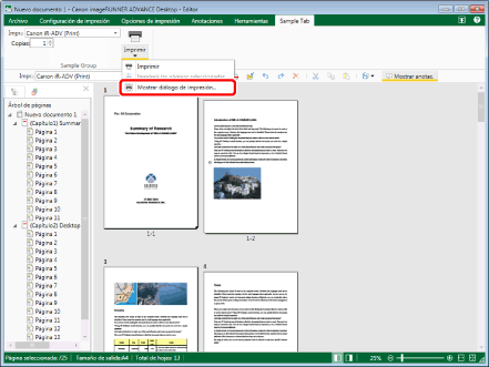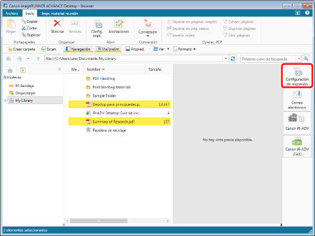 Sin embargo, si marca la casilla [Mostrar diálogo de impresión/envío de fax], la impresión se inicial al hacer clic en [Imprimir] o [Imprimir las páginas seleccionadas]. Si esta casilla no está marcada, aparece el cuadro de diálogo [Imprimir].