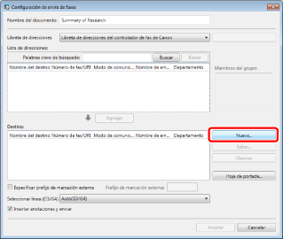 Si selecciona una dirección añadida a [Destino] y hace clic en [Editar], se abre el cuadro de diálogo [Editar nuevas direcciones de destino]. Puede editar la dirección en el cuadro de diálogo.
