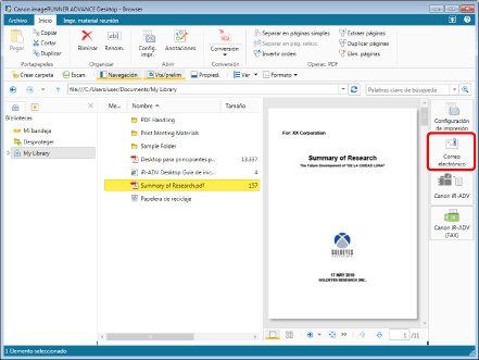 También puede convertir documentos registrados en bibliotecas a documentos PDF y enviarlos por correo electrónico. Para obtener más información, consulte: