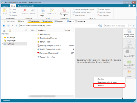 O bien seleccione el menú [Archivo] > [Herramientas] > [Configuración de la barra de salida] > (nombre de carpeta) > [Eliminar].