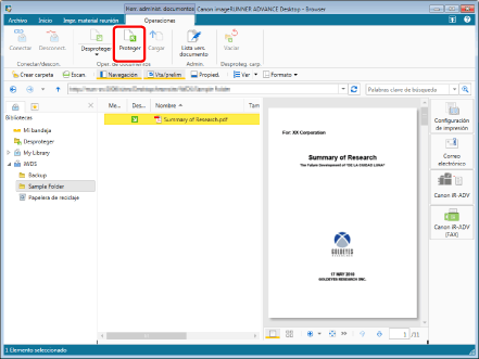 Desproteger el documento protegido desde una Biblioteca de Document Server/Biblioteca de SharePoint Server vuelve a registrarlo en la ubicación original como la versión más reciente del documento y lo pone a disposición de otros usuarios.