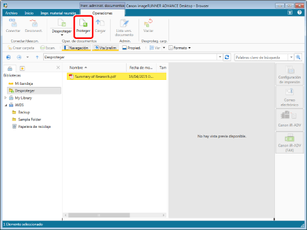 Para obtener más información sobre cómo desproteger y registrar una carpeta o documento en una Biblioteca de Document Server para la que se ha habilitado [Requerir desprotección] consulte: