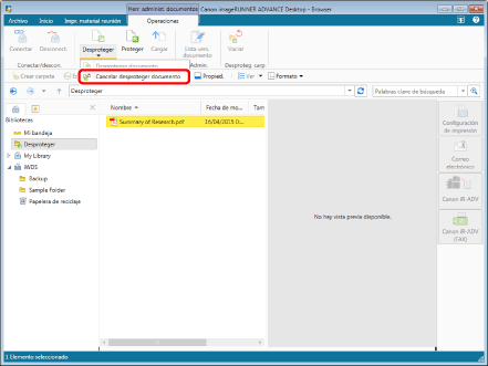 Cuando cancela la desprotección en la carpeta de desprotección, cancele el estado de desprotección de la Biblioteca de Document Server, y después elimine el documento. Cuando cancela la desprotección mientras el documento está abierto, se realiza la cancelación de la desprotección, pero falla la eliminación del documento. Debe cerrar el documento antes de eliminarlo. Elimine el documento manualmente después de cerrarlo.