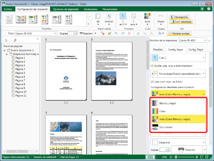 Si una impresora Canon seleccionada en [Impr.] no es compatible con la impresión en color, no se podrá especificar el modo de color.