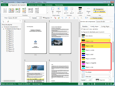 Si se ha seleccionado el modo de dos colores, no puede especificar los ajustes del modo de color para capítulos o páginas específicas.