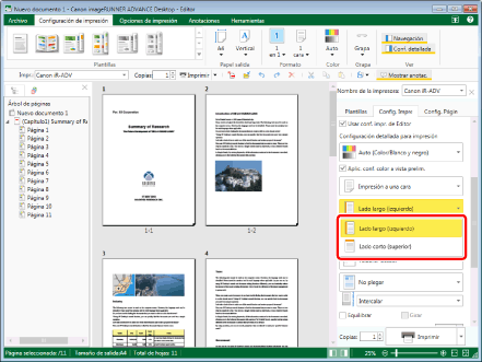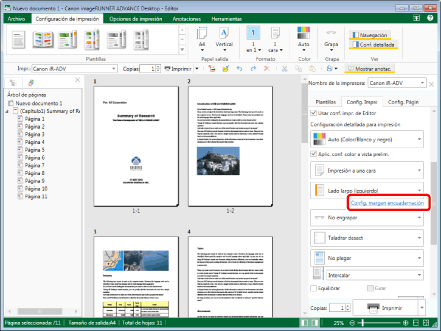 Esta función solo se puede utilizar si selecciona una impresora Canon y la casilla [Usar conf. impr. de Editor] en la pestaña [Config. Impresión] de la Ventana Detalles, el comando de la cinta o el botón de herramienta.