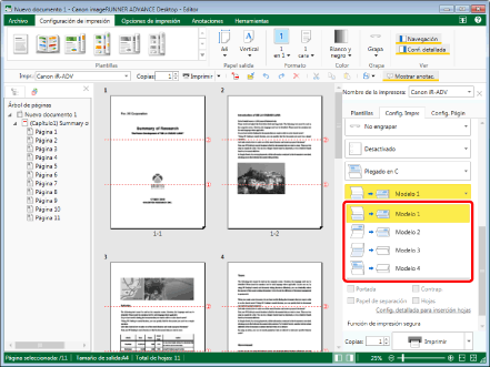 Esta función solo se puede utilizar si selecciona una impresora Canon y la casilla [Usar conf. impr. de Editor] en la pestaña [Config. Impresión] de la Ventana Detalles, el comando de la cinta o el botón de herramienta.