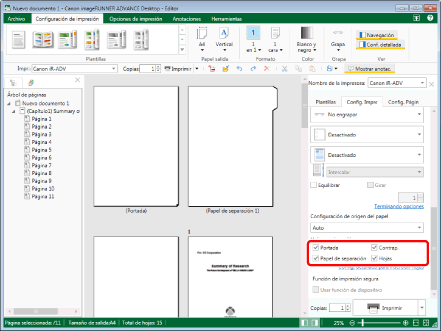 Si se imprime el nombre del capítulo en las pestañas del papel de separación, el nombre del capítulo también se exporta a las pestañas al exportar a un documento PDF.