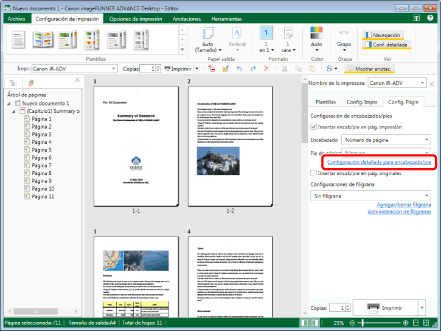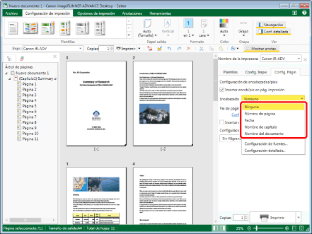 Seleccione [Configuración de fuentes] de la lista desplegable de cada [Encabezado]/[Pie de página] en [Configuración de encabezados/pies] en la pestaña [Config. Página] de la Ventana Detalles