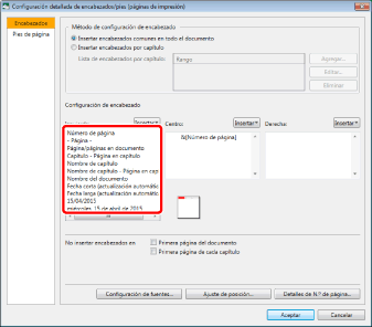 Las opciones de fuente tanto en [Insertar encab/pie en pág. impresión] como en [Insertar encab/pie en pág. originales] son iguales.