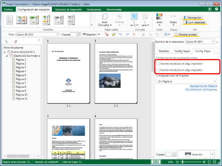 Seleccione la casilla [Insertar encab/pie en pág. originales] para establecer el encabezado/pie de página para la página original. Para usar un comando de cinta para ello, seleccione la casilla [Insertar encab/pie] en el grupo [Pág. originales] de la cinta.
