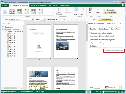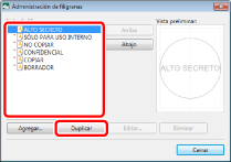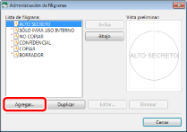 El cuadro de diálogo [Administración de filigranas] aparece al hacer clic en [Administración de filigranas] en la pestaña [Config. Página] de la Ventana Detalles.
