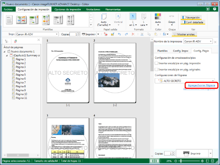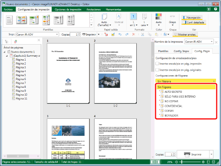 Si añadió varias filigranas a [Filigranas establecidas actualmente] en el cuadro de diálogo [Agregar/borrar filigrana] que aparece al hacer clic en [Agregar/borrar filigrana] en la pestaña [Config. Página] de la Ventana Detalles, la lista desplegable de filigranas de la pestaña [Config. Página] de la Ventana Detalles cambia a [Personalizado].