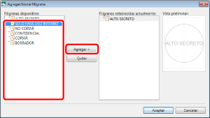 Para eliminar una filigrana, seleccione la que quiera eliminar en [Filigranas establecidas actualmente] y haga clic en [Quitar].