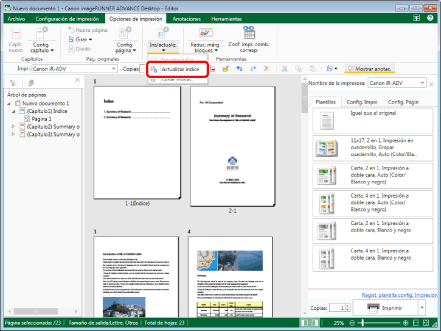 Si se ejecuta [Actualizar índice], la rotación de página establecida para una página de la tabla de contenido se borrará.