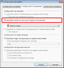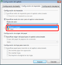 Si la impresora Canon seleccionada en [Impr.] no es compatible con la impresión en color, no se podrá especificar el modo de color por capítulos.