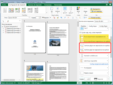 Si no se especifican los ajustes de separación de capítulos, seleccione [No se especificaron separadores de capítulo] en [Configuración de diseño] en la pestaña [Config. Impresión] de la Ventana Detalles. O haga clic en