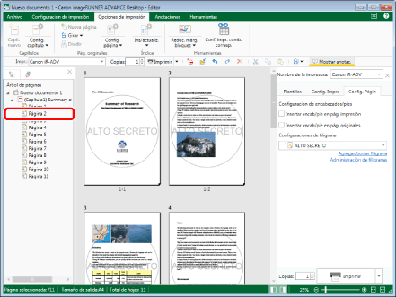 También puede hacer clic con el botón derecho en la página para cambiar los ajustes en la pestaña [Árbol de páginas] de la Ventana de navegación y seleccionar [No insertar filigranas en páginas seleccionadas].