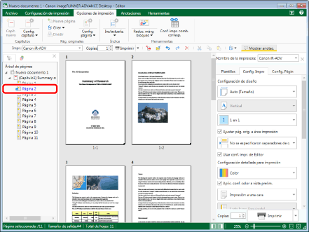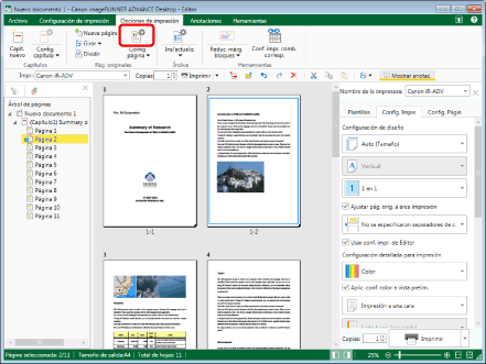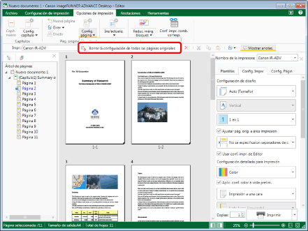 También puede hacer clic con el botón derecho en la página para cambiar los ajustes en la pestaña [Árbol de páginas] de la Ventana de navegación y seleccionar [Borrar configuraciones] en [Origen del papel para páginas originales].