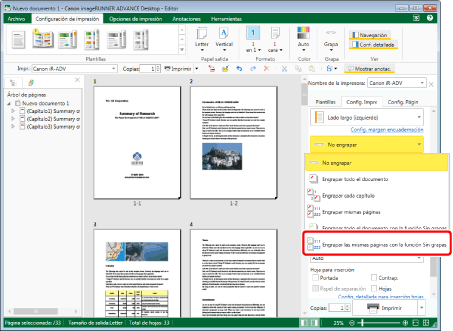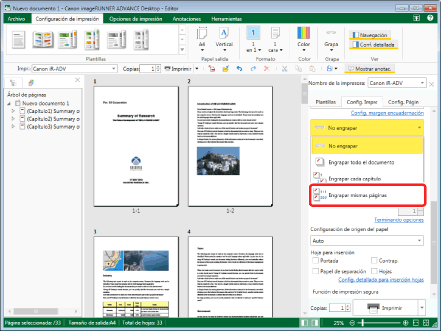 Para obtener más información acerca de cómo configurar los ajustes de grapado por capítulos, consulte: