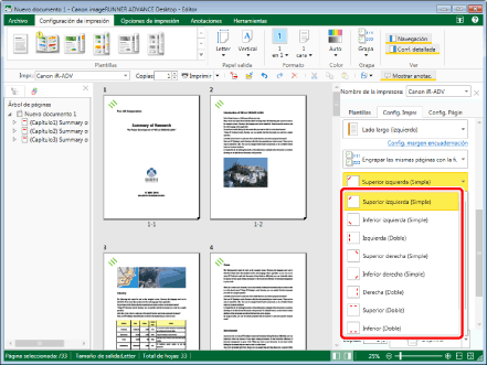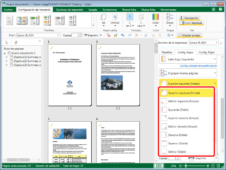 Los ajustes que se pueden seleccionar para la posición de Eco Stapler (sin grapas) varían según el tipo de impresora seleccionada en [Impr.], el tamaño/orientación del papel de salida y la posición de encuadernación.