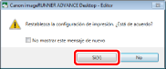 Seleccione el menú [Archivo] > [Opción] > [Configuración del sistema] > [Editor] > [Opciones] > [Mostrar mensaje de confirmación al restablecer la configuración de impresión].