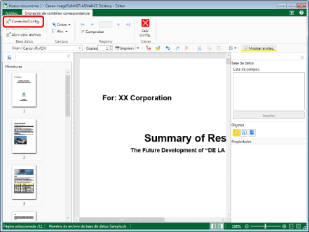 Al conectar con la base de datos, el nombre del archivo de la base de datos conectada aparece en la barra de estado.
