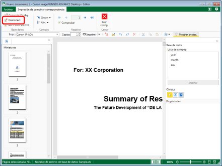 Al desconectar la conexión con la base de datos, los campos colocados dejan de previsualizarse. Podrán previsualizarse al volverla a conectar.