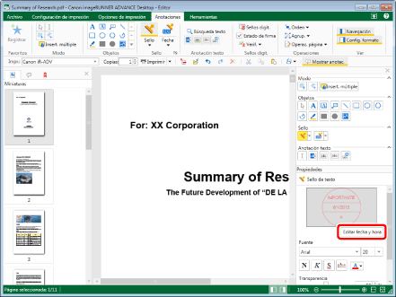 La vista preliminar y las propiedades del sello de texto/fecha seleccionado se muestran en la Ventana Detalles.