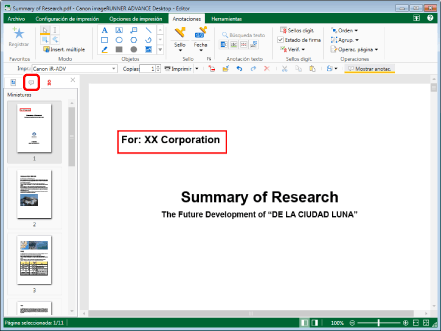 La pestaña [Miniaturas] aparece por defecto en la Ventana de navegación del Modo de anotaciones.