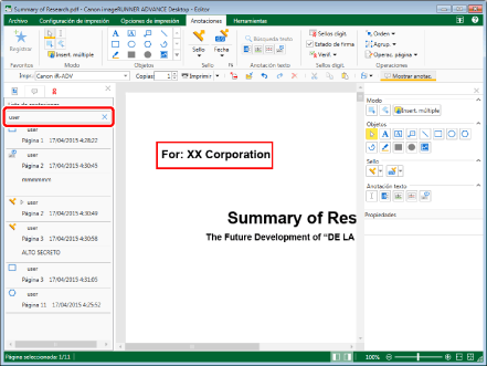 Si hace clic en en el cuadro de búsqueda, el texto de la búsqueda se borrará y se mostrarán todas las anotaciones añadidas al documento en la lista.