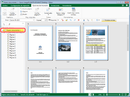 Seleccione (Documento) en la pestaña [Árbol de páginas] de la Ventana de navegación que aparece en el Modo de impresión.