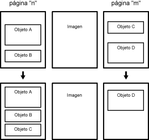 Cuando se ejecuta la función de reducción de márgenes, estos se reducen y los objetos se desplazan hacia arriba en cada página. Además, si aparece un espacio en la parte inferior de una página, los objetos de la página siguiente se desplazan para ocupar ese espacio.