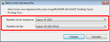 Aparecerán los cuadros de diálogo [Seleccionar impresora/fax] y [Configuración de imageRUNNER ADVANCE Desktop Quick Printing Tool].