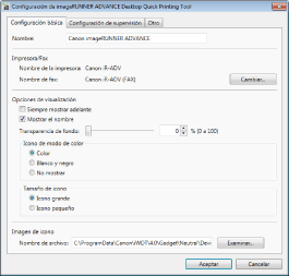 Le permite especificar el icono que indica el modo de color del dispositivo mostrado en la parte superior izquierda de Quick Printing Tool.