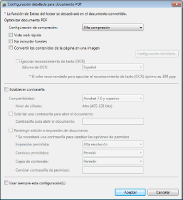 Si selecciona la casilla [Usar siempre esta configuración], el cuadro de diálogo [Configuración detallada para documento PDF] dejará de mostrarse desde la siguiente vez. Si desea que se muestre cuando suelte un archivo, seleccione la casilla de verificación [Mostrar cuadro de diálogo al [Convertir a PDF (Configuración detallada)]].