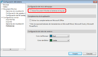 Menú [Archivo] > [Opción] > [Configuración del sistema] > [Configuración común] > [Preferencias] > [Iniciar Document Monitor al arrancar el equipo]