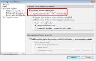 Seleccione esta casilla para proporcionar notificaciones con sonido cuando haya documentos no leídos o actualizados en la carpeta monitorizada.