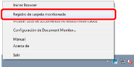Para guardar el registro en [Registro de documentos de carpeta monitoreada], seleccione la casilla [Dejar registro de documentos de carpetas monitoreadas] en el menú [Archivo] > [Opción] > [Configuración del sistema] > [Document Monitor] > [Configuración de carpeta monitoreada].