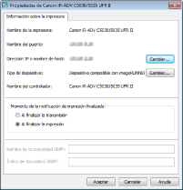 Puede cambiar el momento en que se notifica que la impresión ha finalizado. No se pude establecer cuando [Tipo de dispositivo] es [Otro dispositivo LPR] o se deja en blanco.