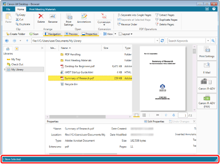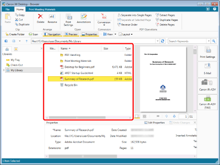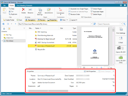 The Properties Window displays the information (properties) of the document or folder selected on the Navigation Window or File List View Window.