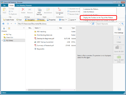 Right-click the ribbon or toolbar and select [Display the Toolbar on the Top of the Ribbon].