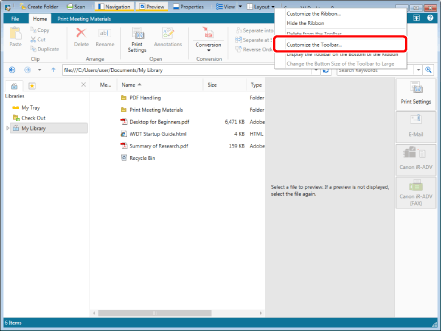 Right-click the ribbon or toolbar and select [Customize the Toolbar].