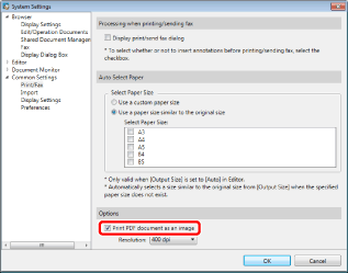 If the [Print PDF document as an image] check box is selected, all PDF documents are printed/faxed as images. Deselect the check box to print/fax them as PDF documents again.