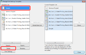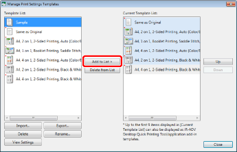 The top nine templates displayed in [Current Template List] in the [Manage Print Settings Templates] dialog box are the print templates specified in the Quick Printing Tool.